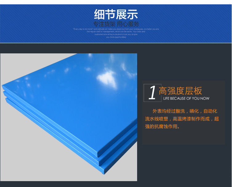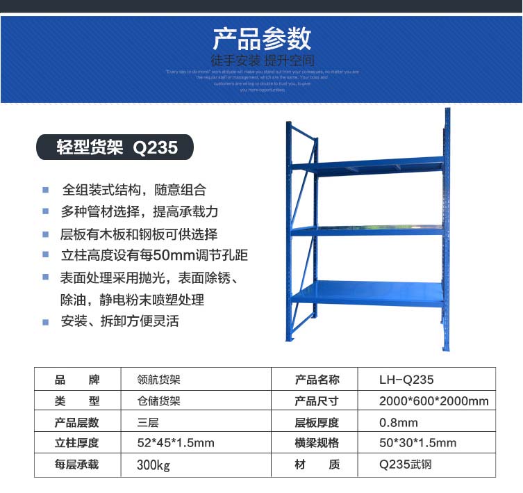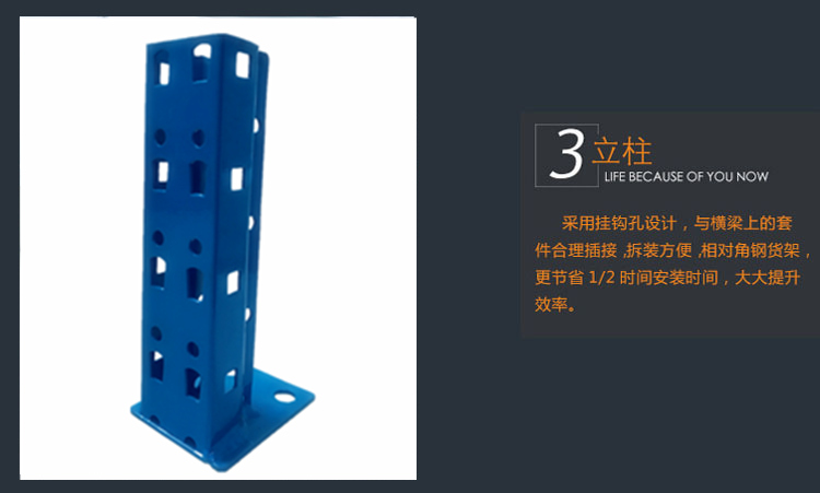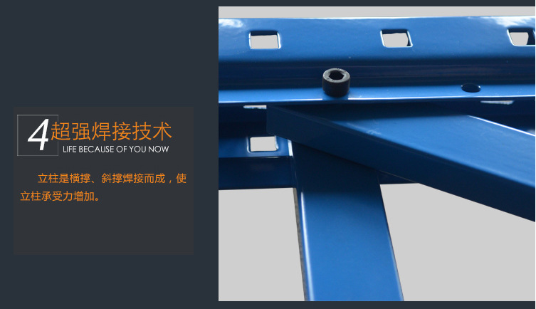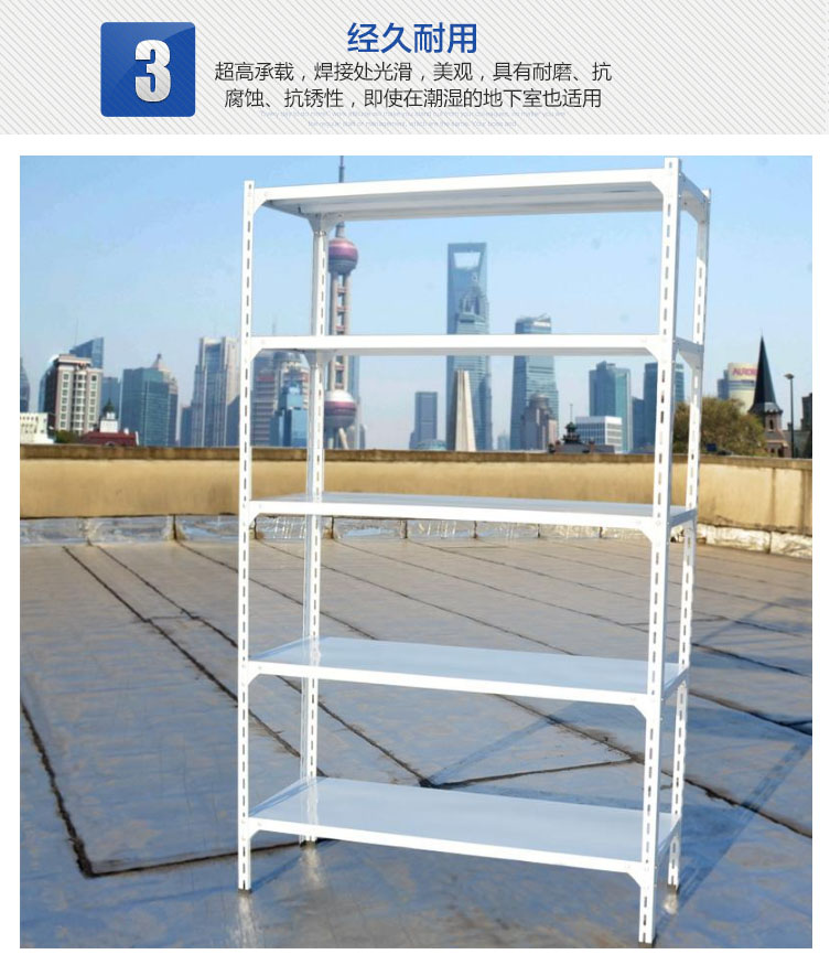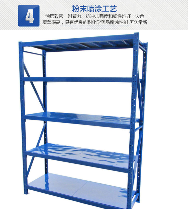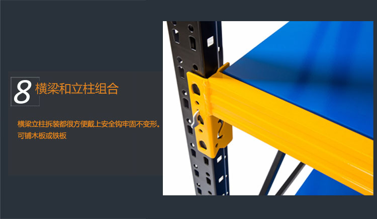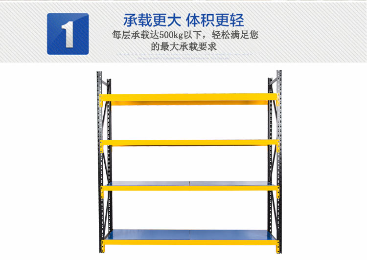 由立柱,橫梁,層板組裝而成的,結構簡單,每層層板最大載重可達300kg,層高50mm任意調節,不用螺栓拼裝而成,安裝拆卸方便,且可無限連接。